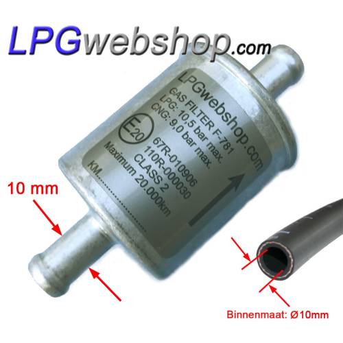 Wegwerfbarer Filter mit hochwertigem Filterelement im Inneren. Für Gasschlauch mit Innendurchmesser 10/11mm