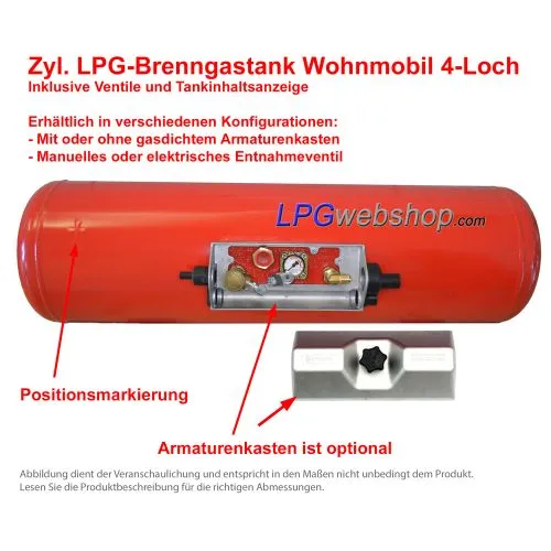 Dieser LPG-Brenngastank ist mit 4 Anschlüssen ausgestattet; ein 80 % Füllstopp mit Rückschlagventil, ein Überdruckventil (Abblaseventil), ein Entnahmeventil (manuell oder elektrisch betätigt), ein Füllstandsmesser mit Uhr. Ein optionales gasdichtes Gehäuse (Armaturenkasten) umschließt diese Armaturen und kann eventuell austretende Gase auffangen.