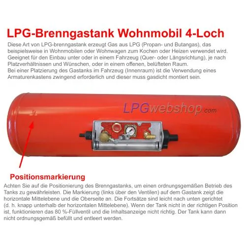 Tankposition: Horizontal, Ventile nach unten geneigt. Siehe Markierung (Kreuz mit Pfeil) auf dem Gastank, die die Oberkante und die horizontale Mitte anzeigt.