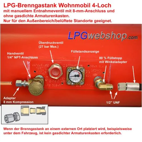 Dieser LPG-Brenngastank ist mit 4 Anschlüssen ausgestattet; ein 80 % Füllstopp mit Rückschlagventil, ein Überdruckventil (Abblaseventil), ein Entnahmeventil (manuell oder elektrisch betätigt), ein Füllstandsmesser mit Uhr. Ein optionales gasdichtes Gehäuse (Armaturenkasten) umschließt diese Armaturen und kann eventuell austretende Gase auffangen.