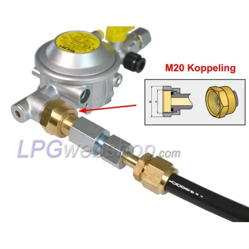 Input: M20 Female (internal) with swivel. Connects to pressure regulator inlet)