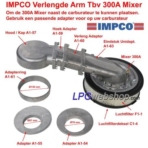 Application: The IMPCO hood (A1-57) goes on top of the carburetor using a suitable adapter (A1-54 / A1-55 / A1-61). and is used to make an arm on the carburetor to connect the 300A mixer position next to it. Can be additionally extended with the adapters A1-59 and/or A1-60. The end piece(A1-63) Unidapt is used to mount the 300A mixer. For American classics with the brands; Chevrolet, Ford, Chrysler, Dodge, Cadillac, etc. to run on LPG in combination with an IMPCO 300A mixer.