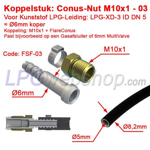Used in combination with plastic LPG pipe LPG-XD-3 DN 5 (= Ø6 mm Copper) and an LPG part with an M10x1 connection.