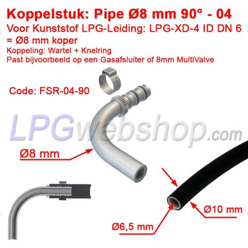 This part is used in combination with plastic LPG pipe LPG-XD-4 DN 6 (= Ø8 mm Copper) and an LPG part with a compression connection. using a swivel and a compression ring, the pipe can be connected at a right angle 90°. 1x Oetiker clamp is included. Excluding Swivel and compression ring.