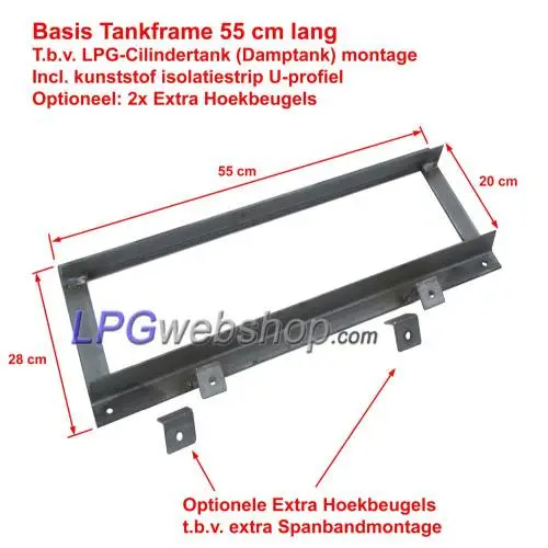 LPG Tank Frame 55 cm for LPG cylinder tank mounting (vapor tanks) in combination with lashing straps (tank straps). Suitable for LPG cylinder tanks with a diameter of 27 cm and up to 40 cm and a maximum length of approximately 65 cm. The tank straps are standard not included with this product. Order them yourself according to your choice and needs. We have two types of lashing straps: 20 mm wide and 30 mm wide. (See related products on this page.)