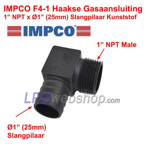 Conexión de gas en ángulo recto IMPCO F4-1 de 1” NPT x Ø1” (25 mm) de espiga para manguera de plástico