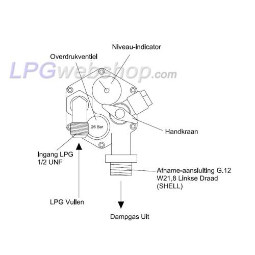 - Conexión única para llenado y extracción de gas: G.12 = W21.8 x 1/14 (M22) (Conexión SHELL de rosca izquierda con junta de goma)