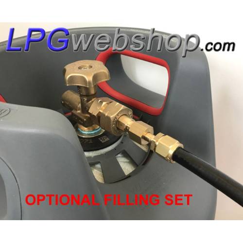 Bombona ligera de gas GLP, de material compuesto rellenable con GLP, equipado con un limitador de llenado del 80 % y una válvula de alivio de presión. El material compuesto (plástico) lo hace robusto y resistente a la corrosión. El cilindro semitranslúcido permite ver la cantidad de gas restante.