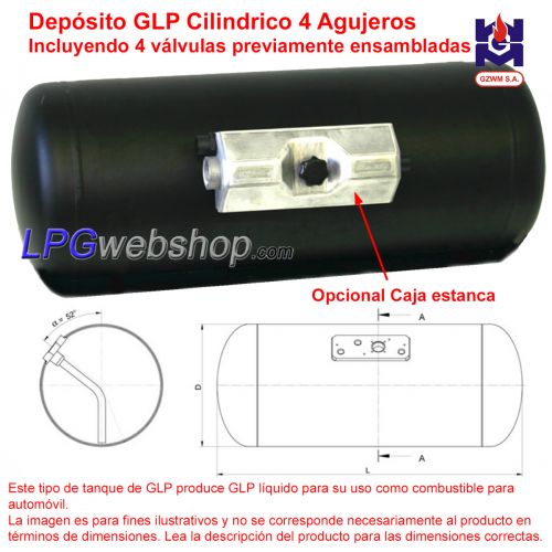 Este tipo de tanque de GLP libera GLP líquido, que se utiliza como combustible para automóviles. Apto para instalación empotrada o bajo estructura, y para la mayoría de los sistemas de GLP: Landi Renzo, Vogels VGI, Eurogas, Prins VSI, BRC, Romano, Tartarini, AEB, etc.
