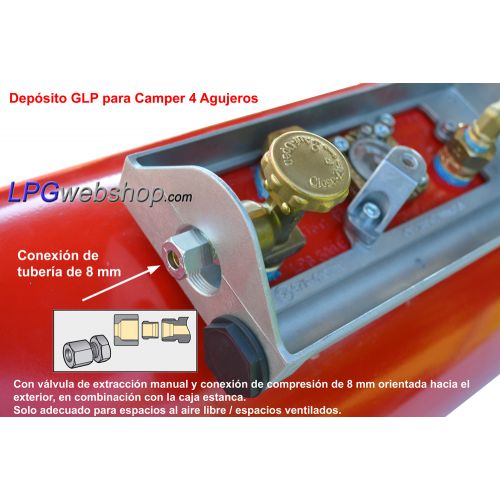 Al utilizar una Llave de Paso con conexión SHELL Macho G.5 Kombi (G.2/G.4/G.8) (Roscado W21,8x1/14 a Izquierdas), NO es posible sellar correctamente la caja estanca a los gases, por lo que esta combinación básicamente solo es adecuada para instalación inferior o, en el caso de instalación empotrada (espacio interior), solo en un compartimento ventilado que esté aislado del resto del vehículo.