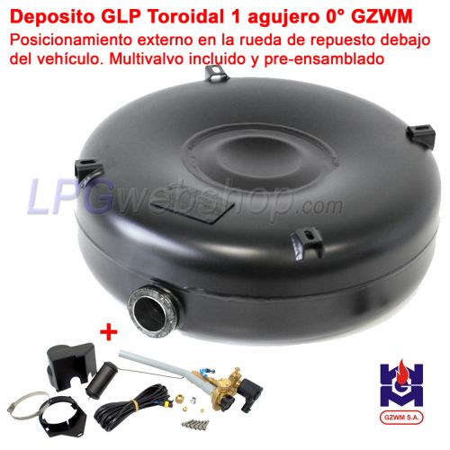 Depósito GLP Toroidal de 92 litros (Ø720x270) GZWM, 1-Agujero 0° Externo Multiválvula incluida premontada. Apto para vehículos con rueda de repuesto colgada debajo.
