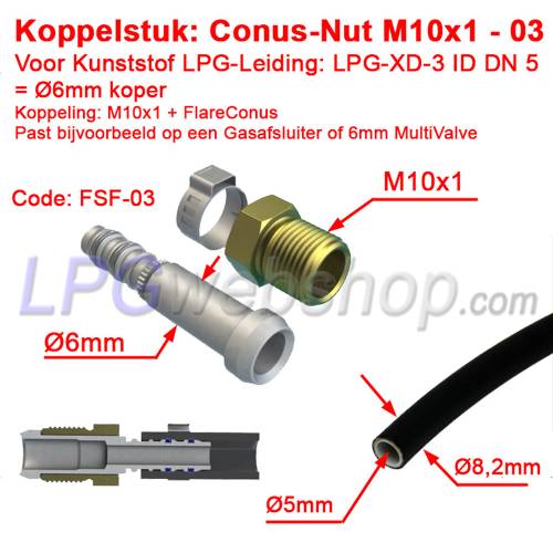 Una tubería flexible de plástico para GLP no se conecta directamente a una pieza de GLP, sino que se utilizan piezas de acoplamiento en los extremos de la tubería. Estas vienen en diferentes formas y tamaños. También hay varios tipos de tuberías de plástico para GLP disponibles. Hay diferentes diámetros, marcas y tipos de conectores. Asegúrese de usar la correcta para su aplicación, junto con los acoplamientos adecuados en los extremos de la tubería. Junto con la tubería, puede elegir el tipo de acoplamiento y la cantidad que desee pedir. Utilice los acoplamientos adecuados según el tipo de conexión al componente de GLP y el espacio disponible.
