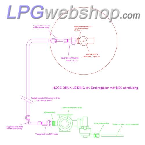 Este producto permite realizar una conexión entre un tanque de gas vapor (con una conexión de compresión de 8 mm) o, por ejemplo, de una botella de gas (con una conexión SHELL) a un regulador de presión con una conexión M20 (GOK / TRUMA / CAVAGNA).