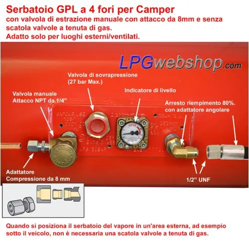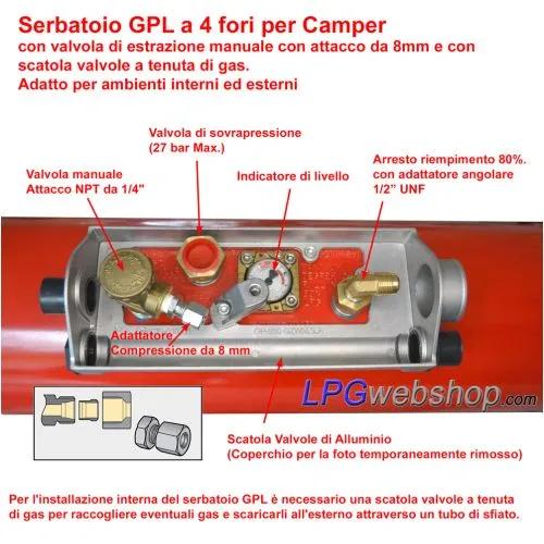 Questo serbatoio ricaricabile GPL Camper è dotato di 4 raccordi; un arresto di riempimento ricaricabile all'80% con valvola di non ritorno, una valvola di sovrapressione (valvola di sicurezza), una valvola di estrazione (a comando manuale o elettrico), un misuratore di livello con orologio. Un alloggiamento opzionale a tenuta di gas (scatola valvole) racchiude questi raccordi e può raccogliere eventuali perdite di gas.