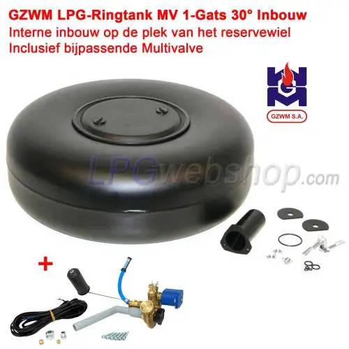 Serbatoio Bombola GPL Toroidale 61,5 Litri (Ø680x220) GZWM 1 Foro 30° Interno Auto - Multivalvola inclusa. Questo tipo di serbatoio GPL ad anello per auto è previsto per l'installazione a filo nella posizione della ruota di scorta.