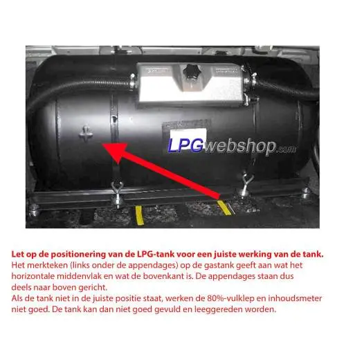 Bepaal goed de positie van de gastank. Let hierbij goed op het markeerteken (kruis met pijl) op de gastank voor een correcte positionering t.b.v. een goede werking van de gastank. Het markeerteken geeft de bovenzijde en het horizontale middenvlak aan. En let hierbij ook goed op de positie van flensen van de beugels t.o.v. de tankappendages (tankkast), zodat in- en uitgaande leiding niet worden geblokkeerd. Gebruik een voldoende aantal bouten van de juiste kwaliteit voor een voldoende sterke constructie.