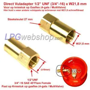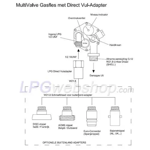 - Enkelvoudige aansluiting voor zowel het vullen als gasafname: G.12 = W21.8 x 1/14 (M22) (Linkse draad type SHELL aansluiting met rubber afdichtring)