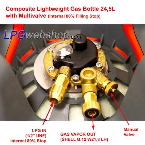 Deze hervulbare lichtgewicht LPG-gasfles met Multivalve heeft separate aansluitingen; een ingang voor het vullen en een uitgang.