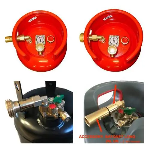 Deze adapter past direct op de 80%-vulklep (op kniestuk) van bijvoorbeeld een 4-gats gasfles of Damptank of een Gasfles met een MultiValve (zie voorbeelden).