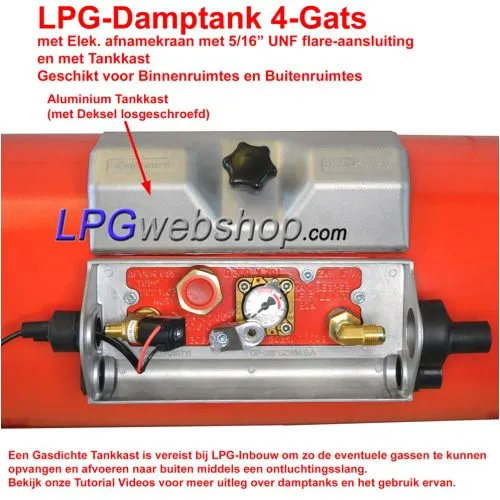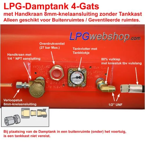 Deze dampgastank is voorzien van 4 appendages; een 80%-vulklep met terugslagklep, een overdrukventiel (afblaasventiel), een afnamekraan (handmatig of elektrisch bedienbaar), een inhoudsmeter met klokje. Een optionele tankkast omsluit deze appendages en kan eventuele afblaasgassen opvangen. Om op het dashboard de tankinhoud te kunnen bekijken is er een Led-indicator met tanksensor optioneel verkrijgbaar. Op de 80%-vulklep met kniestuk kan een vulslang te worden aangesloten, welke is verbonden met een vulaansluiting op het voertuig. De gasdruk uit de damptank dient te worden gereduceerd en afgeregeld middels een drukregelaar.