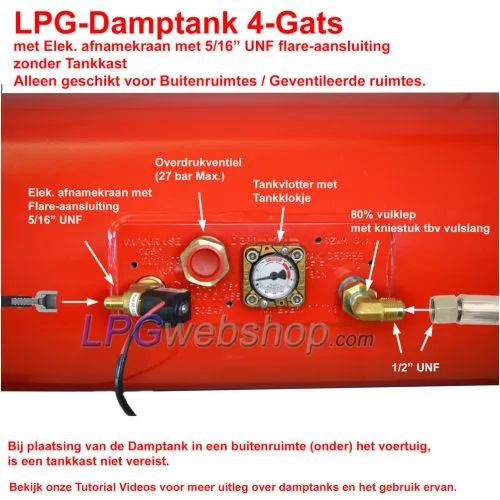 Deze dampgastank is voorzien van 4 appendages; een 80%-vulklep met terugslagklep, een overdrukventiel (afblaasventiel), een afnamekraan (handmatig of elektrisch bedienbaar), een inhoudsmeter met klokje. Een optionele tankkast omsluit deze appendages en kan eventuele afblaasgassen opvangen. Om op het dashboard de tankinhoud te kunnen bekijken is er een Led-indicator met tanksensor optioneel verkrijgbaar. Op de 80%-vulklep met kniestuk kan een vulslang te worden aangesloten, welke is verbonden met een vulaansluiting op het voertuig. De gasdruk uit de damptank dient te worden gereduceerd en afgeregeld middels een drukregelaar.