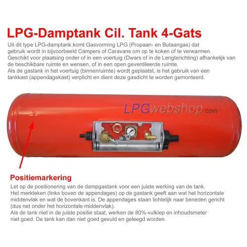 LPG-Dampgastank Cilindertank  4-gats GZWM 20 Liter (Ø200 x L720) incl. appendages en tankklokje. Gastank tbv Camper, Caravan of Foodtruck