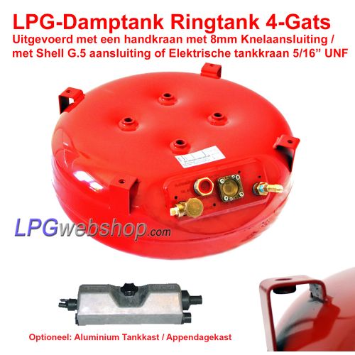 Deze dampgastank heeft de vorm van een (reserve)wiel en kan daardoor gemakkelijk op de plaats van het reservewiel worden gemonteerd. De tank is voorzien van 4 appendages; een 80%-vulklep met terugslagklep, een overdrukventiel (afblaasventiel), een afnamekraan (handmatig of elektrisch bedienbaar), een inhoudsmeter met klokje. Een optionele tankkast omsluit deze appendages en kan eventuele gassen opvangen. Om in het voertuig de tankinhoud te kunnen aflezen is er een Led-indicator met tanksensor optioneel verkrijgbaar. Op de 80%-vulklep met kniestuk kan een vulslang met een 1/2"UNF aansluiting worden aangesloten, welke aan de ander zijde is verbonden met een vulaansluiting op het voertuig. De gasdruk uit de gastank dient te worden gereduceerd en afgeregeld middels een drukregelaar. Geen 10-Jarige herkeuring nodig dankzij Hoogwaardige Automotive ECE 67R-01 Goedkeuring. Bestudeer de onderstaande informatie goed.