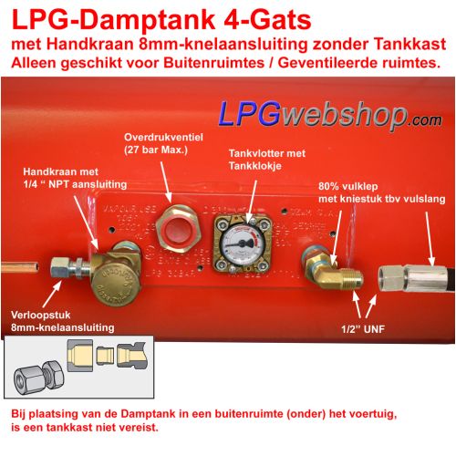 In geval van een handkraan met een 8mm-knel aansluiting kan de tankkast wel gasdicht worden aangesloten als de handkraan met de uitgang naar binnen staat gericht. (de gasleiding kan dan in een lus in de tankkast worden gelegd of via dezelfde kant als de vulslang uit de tankkast verlaten).