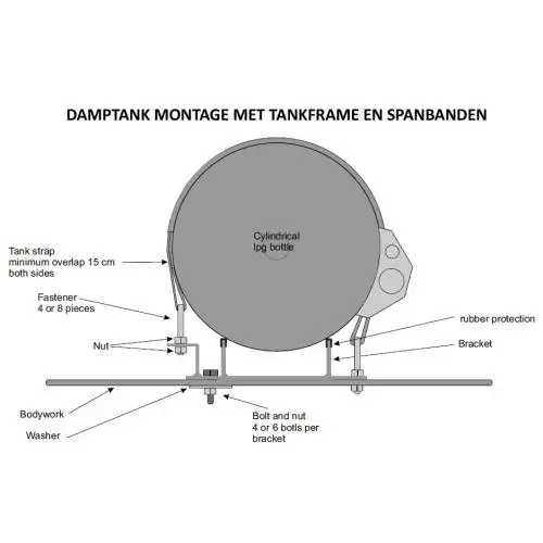 Voor onderbouw van een LPG-cilindertank groter dan 80L (waar de spanbanden ook het gewicht van de tank moeten dragen), adviseren we deze te monteren m.b.v. montageringen of montagebeugels in plaats van m.b.v. een tankframe en spanbanden.
