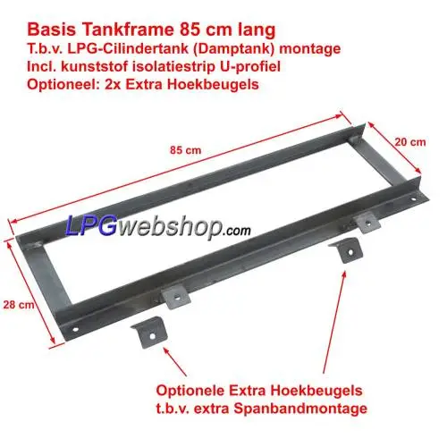 Tankrek 85 cm t.b.v. LPG-cilindertankmontage (damptanks) i.c.m. spanbanden (Tankbanden). Geschikt voor LPG-cilindertanks met een diameter van 27 cm en tot 40 cm en een maximale lengte van ongeveer 95 cm. De spanbanden zijn niet inbegrepen bij dit product. Bestel deze zelf naar keuze en behoefte mee. We hebben twee type spanbanden: Van 20 mm breed en van 30 mm breed. (Zie gerelateerde producten op deze pagina.)